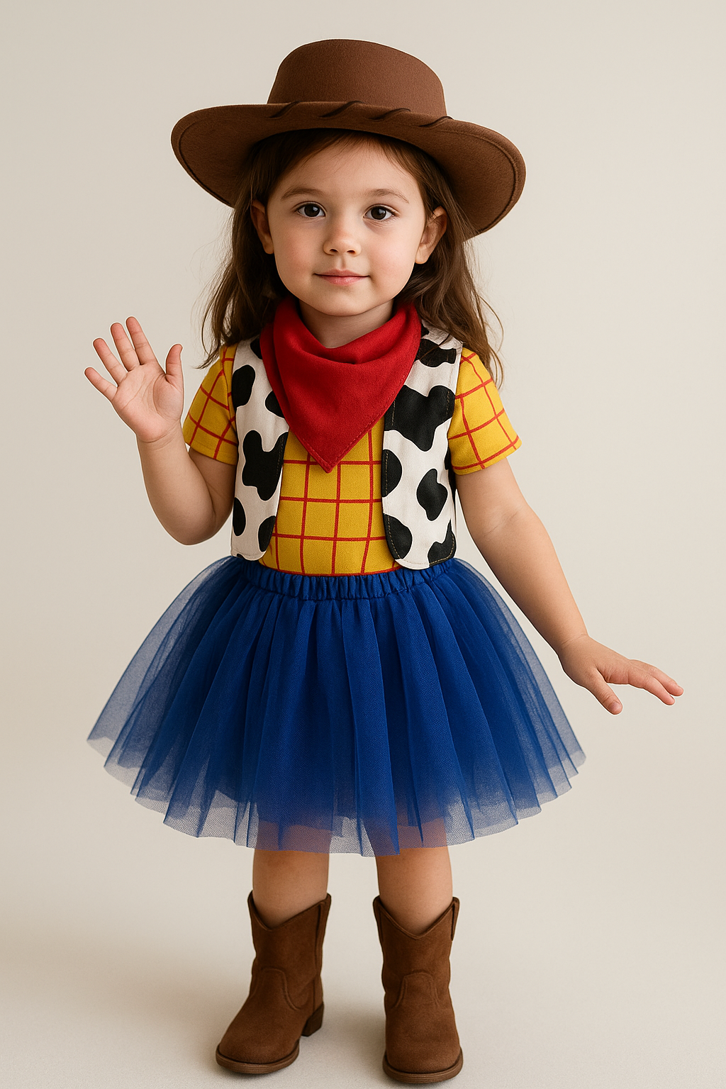 Haz que tu pequeña brille con este encantador disfraz de vaquerita inspirado en Jessy. Ideal para fiestas, Halloween, presentaciones escolares o juegos de rol que despiertan la imaginación.