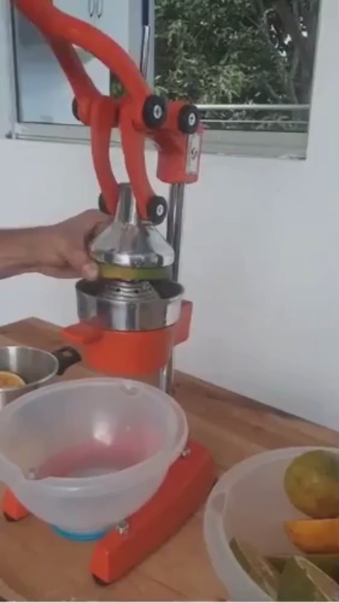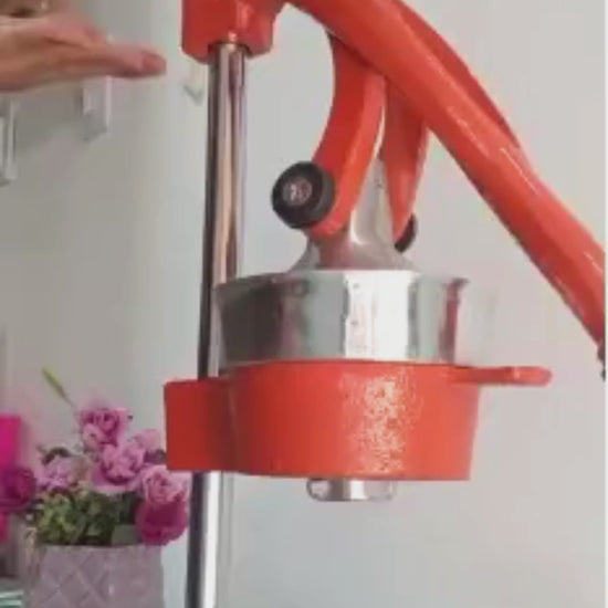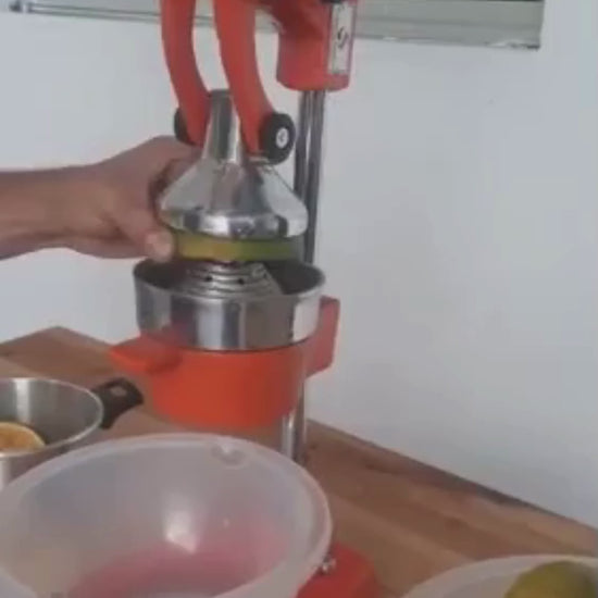 Exprimidor de naranjas tipo industrial, fabricado en aluminio fundido 98 % puro, ideal para trabajos exigentes como la venta continua de jugo.